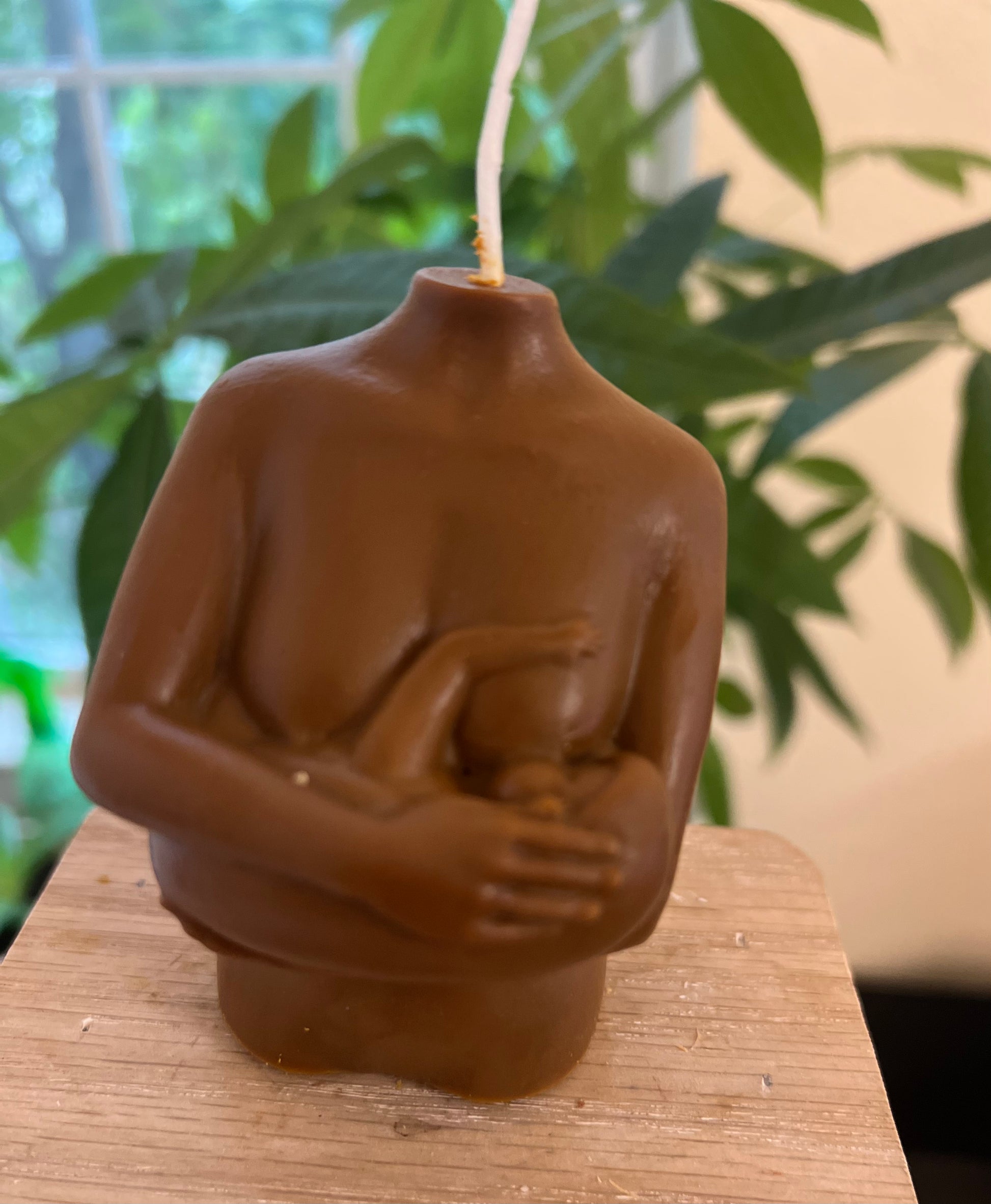 This candle depicts a person nursing their baby. An ideal gift for a blessing way, baby shower, lactation consultant gift, midwife gift, or as part of a birth kit, the recipient will feel empowered!