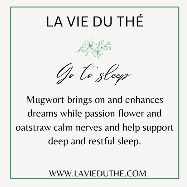 Mugwort brings on and enhances dreams while passion flower and oatstraw calm nerves and help support deep and restful sleep.